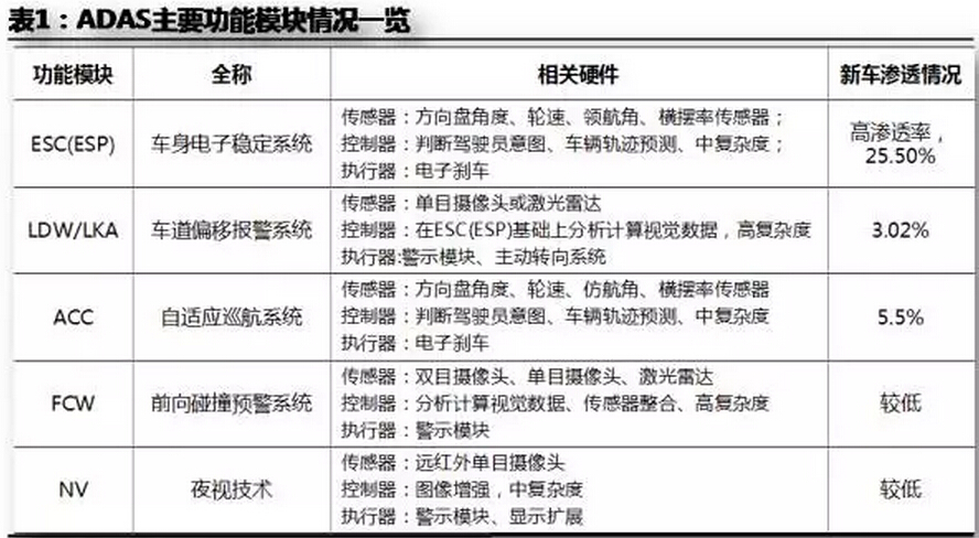 ADAS 系統(tǒng)主要包括如下功能模塊:車身電子穩(wěn)定系統(tǒng)ESC(ESP)、自適應(yīng)巡航系統(tǒng)ACC、車道偏移報(bào)警系統(tǒng)LDW、車道保持系統(tǒng)LKA、前向碰撞預(yù)警系統(tǒng)FCW、自動緊急剎車系統(tǒng)AEB、交通標(biāo)志識別TSR、盲點(diǎn)探測BSD、夜視系統(tǒng)NV、自動泊車系統(tǒng)APS、輪胎壓力監(jiān)測系統(tǒng)(TPMS)等。