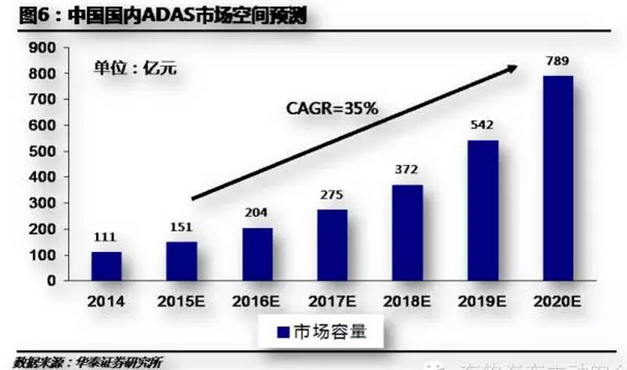 ADAS年復(fù)合增長率達(dá)35%,2020年中國市場可實(shí)現(xiàn)近800億市場空間。2014年,前裝市場ADAS新車滲透率在15%左右,主要集中在法規(guī)較為嚴(yán)格的美系、德系中高端車型市場。隨著國內(nèi)法規(guī)進(jìn)一步健全,市場對于ADAS需求的日益嚴(yán)格,前裝市場迎來滲透率大爆發(fā),保守預(yù)計(jì)新車滲透率增速30%,汽車銷量年增速4%。受整車銷量、滲透率兩方面因素驅(qū)動,我們預(yù)計(jì)至2020年,ADAS市場可實(shí)現(xiàn)788億空間,年復(fù)合增速近35%。