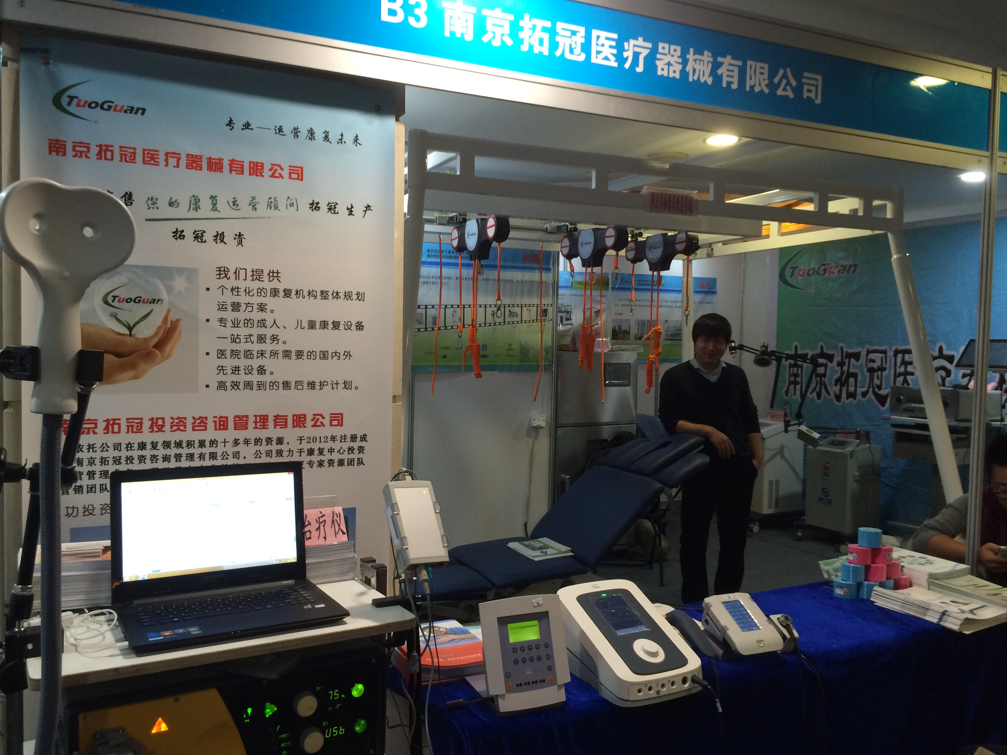 “第四屆金陵康復(fù)醫(yī)學(xué)高層論壇”于2015年11月20日在南京國際會(huì)議中心隆重拉開帷幕。拓冠攜自主產(chǎn)品滑軌式懸吊系統(tǒng)(TG-NPT-X1)、荷蘭En-raf的超聲及電療治療儀(Sonopuls 492 )、超聲治療儀(Sonopuls 190)、神經(jīng)肌肉刺激器(En-Stim4)、大功率短波治療儀(Curapuls 970)、大功率微波治療儀(Radarmed 950+)、三段四折多體位治療床(623),偉思的生物刺激反饋系統(tǒng)(S4)、經(jīng)顱磁刺激儀,語路的全自動(dòng)蠟療(Y-8160LQ),君樂寶的功能磁刺激治療工作站(LM-4000型)、俄羅斯GTMEDI的經(jīng)顱磁刺激儀(TMS)、健力普的半導(dǎo)體激光治療儀(JLP—280A)、紅外偏振光治療儀(JLP—600B),美國的肌肉關(guān)節(jié)振動(dòng)治療儀(Pulstar G3)亮相金陵康復(fù)醫(yī)學(xué)高層論壇,展示了國內(nèi)外更為優(yōu)質(zhì)、更具有競爭力的康復(fù)設(shè)備。